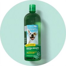 - Dental chews and treats: Made with breath-freshening ingredients and designed to fight and prevent plaque buildup off your dog’s teeth as they chew