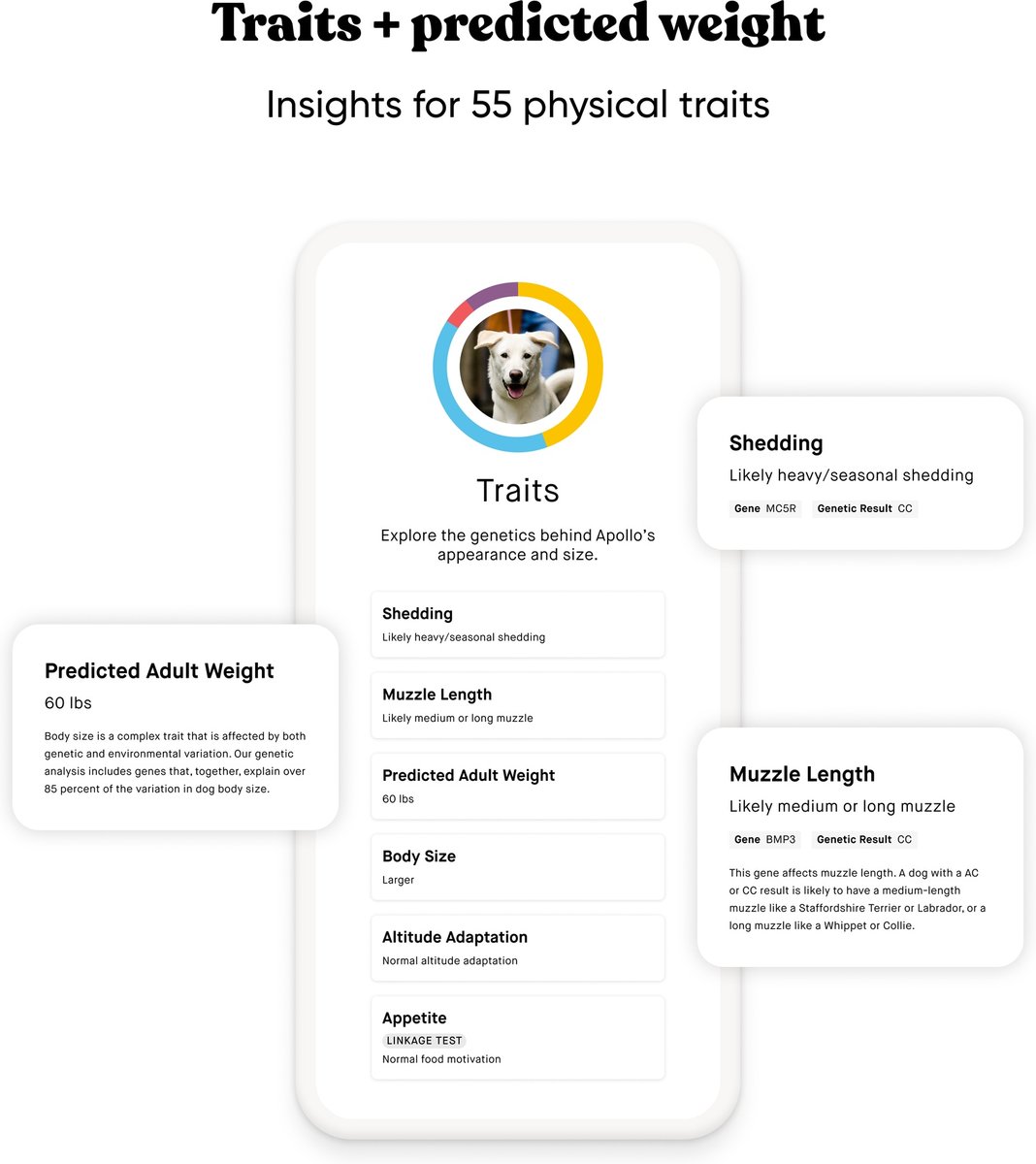 - Test for 55 physical traits, including size, coat, and grooming needs, and learn what to expect as your pup grows up.