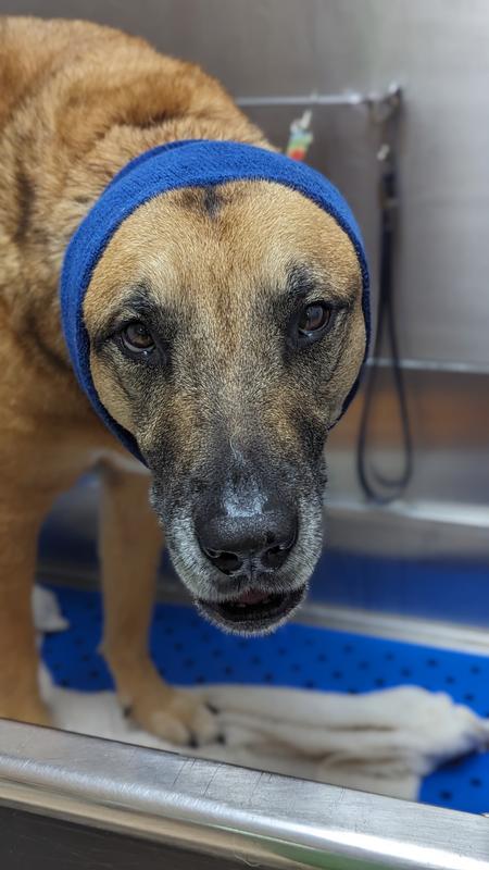 I own a handsome 100lb Anatolian Shepherd mix who is well trained, but if he chooses to not take a bath there's little I can do to stop him. Without his ears though he's like puddy in my hands. I've been using one of these since he was about 2 years old (he's 8 now) and it's night and day difference getting his bathed and blow dried. He no longer tries to escape and we leave it on while the techs do his nail trim and he's perfectly behaved for them. Added bonus he looks adorably sadden that he doesn't have ears and gets super excited when I give him his ears back.