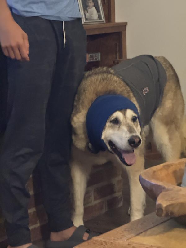 Our 85lb hound is shaking-scared of fireworks and thunder and will try to get on the bed. I think he acts a bit put upon wearing this. It’s not his favorite and he acts like more of an awkward clown than usual. His ears are ginormous so we have to tuck them in carefully but he got through the 4th of July mostly laying on the bed. It either distracts him or muffles them enough that he doesn’t seem scared. Weathered a few nights of fireworks and thunderstorms so far and it’s a keeper. May keep things a little warm and yeasty in his years so he wont keep it on longer than necessary but I’m pleasantly surprised and how this helped him.