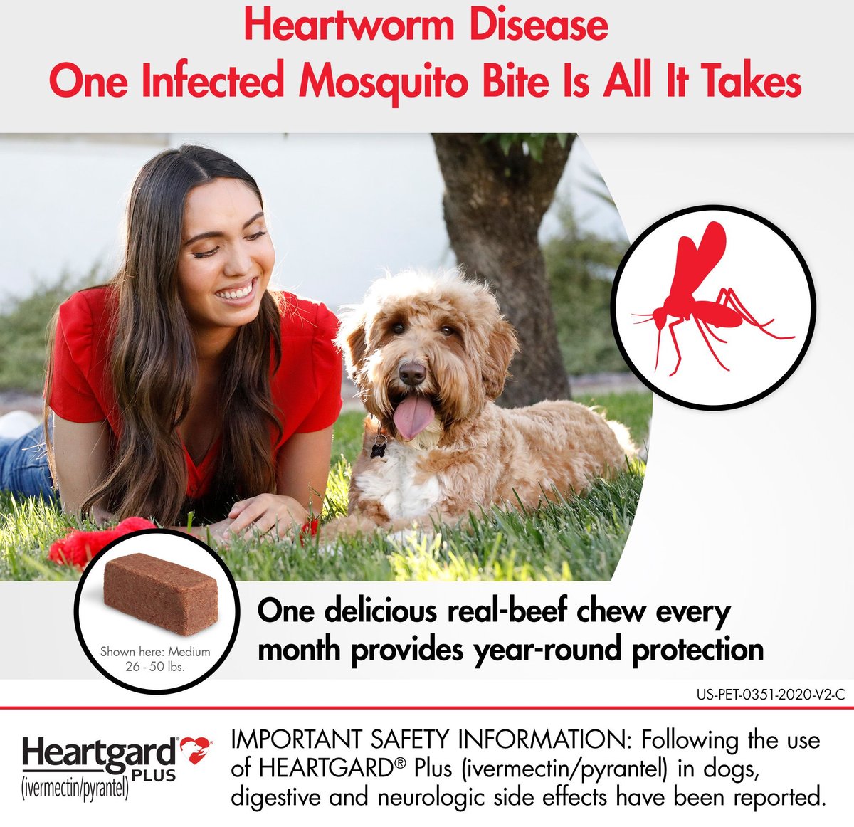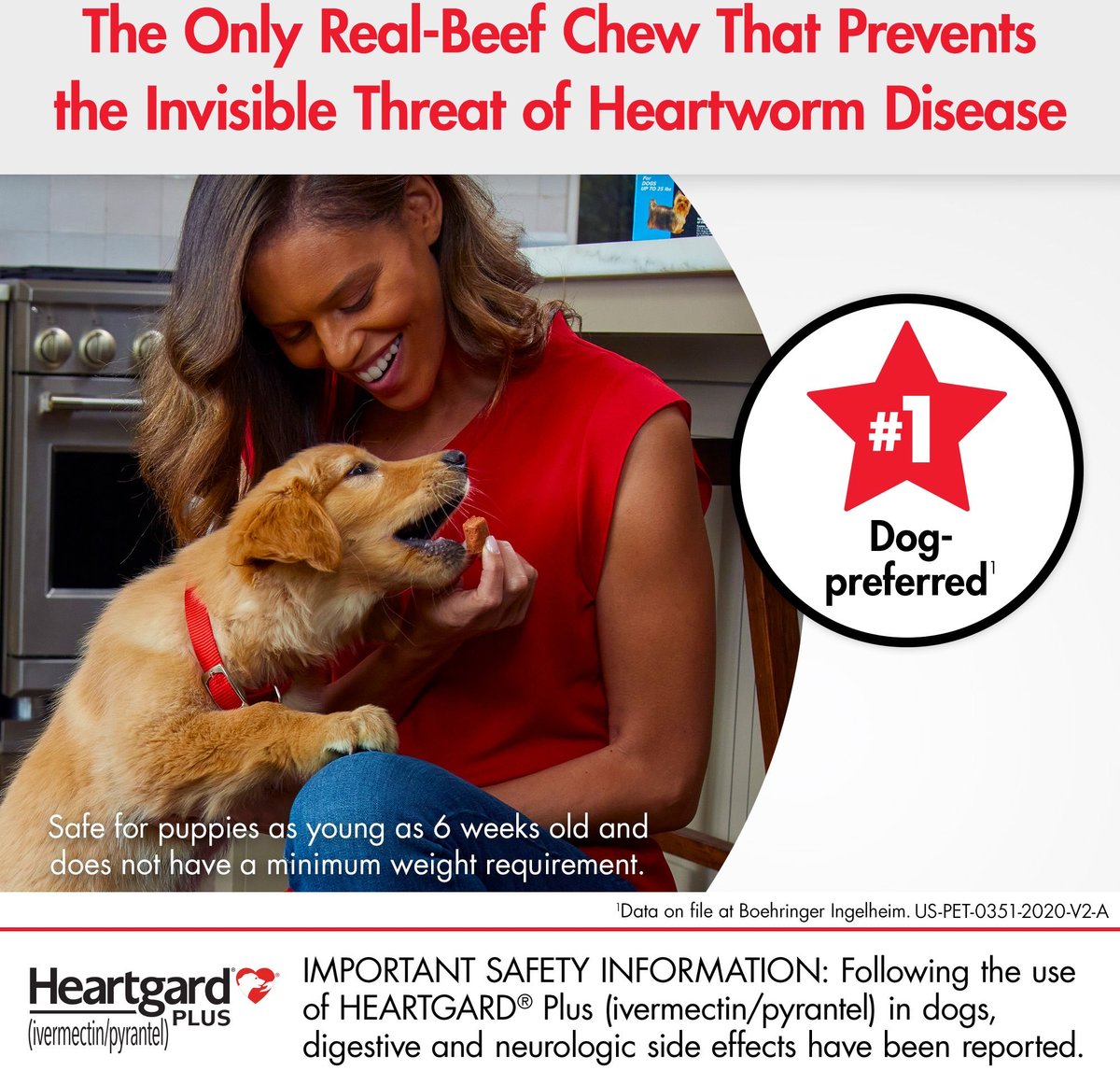 Just one bite from an infected mosquito could put your dog at risk for heartworm disease, but HEARTGARD Plus offers the protection your dog needs. This heartworm preventive is made with real beef and has a savory taste, making it the #1 dog-preferred chew. HEARTGARD Plus makes protecting your dog year-round easy and enjoyable month after month.*