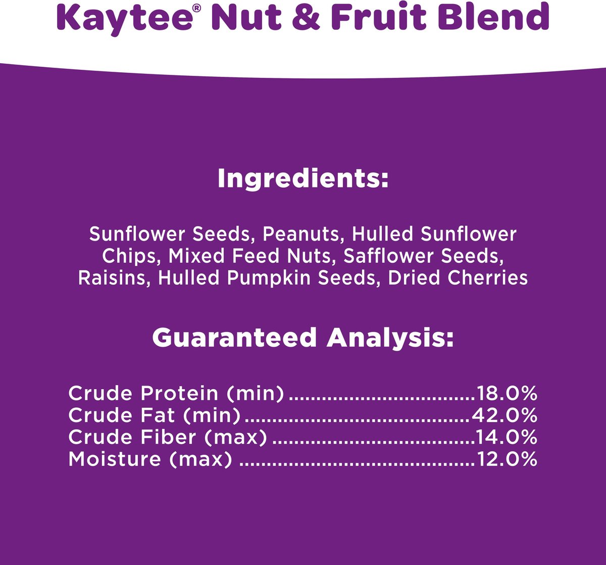 Formulated by birding enthusiasts, Kaytee Nut & Fruit Blend is a premium blend designed to keep colorful songbirds flocking to your backyard. Nutritious and delicious, it will keep your backyard a consistently popular spot for your feathered friends.