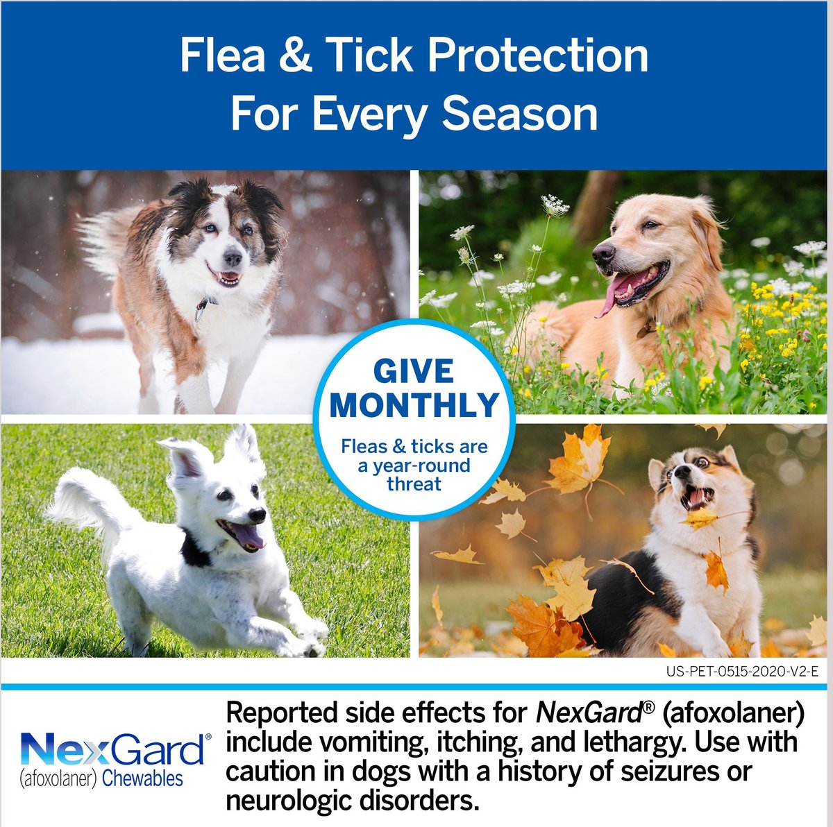 Your dog can get fleas any time of the year throughout much of the United States. And some ticks, including those that transmit Lyme disease, can be active in temperatures that are just above freezing. Just 1 monthly NexGard chew will kill fleas and ticks and protect your dog, no matter the season.