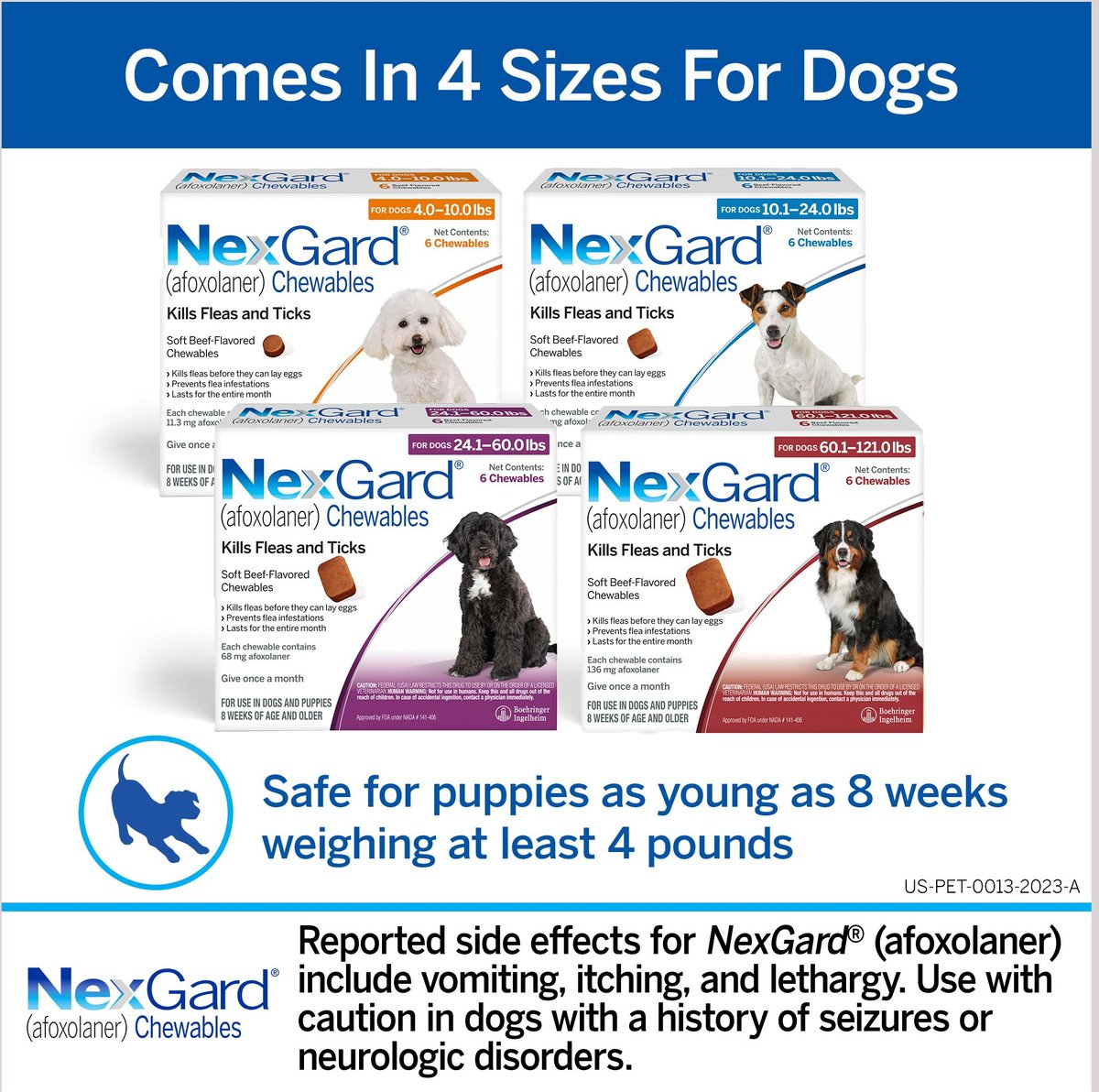 - NexGard Chewables for Dogs, 24.1-60 lbs, (Purple Box), 6 Chewable Tablets (6-mos. supply)$158.39 Chewy Price$150.47 Autoship PricePromo, Save 20% on your first Autoship +2 deals