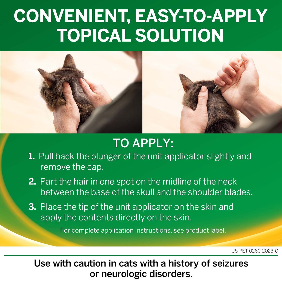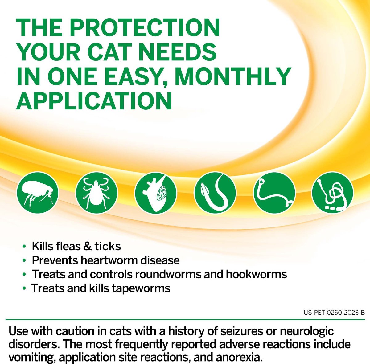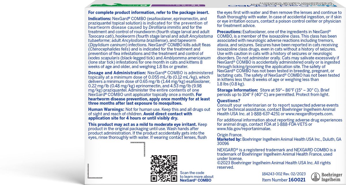 NexGard COMBO (esafoxolaner, eprinomectin, and praziquantel topical solution) for cats kills fleas & ticks, prevents heartworm disease, treats and controls roundworms, hookworms, and tapeworms.
