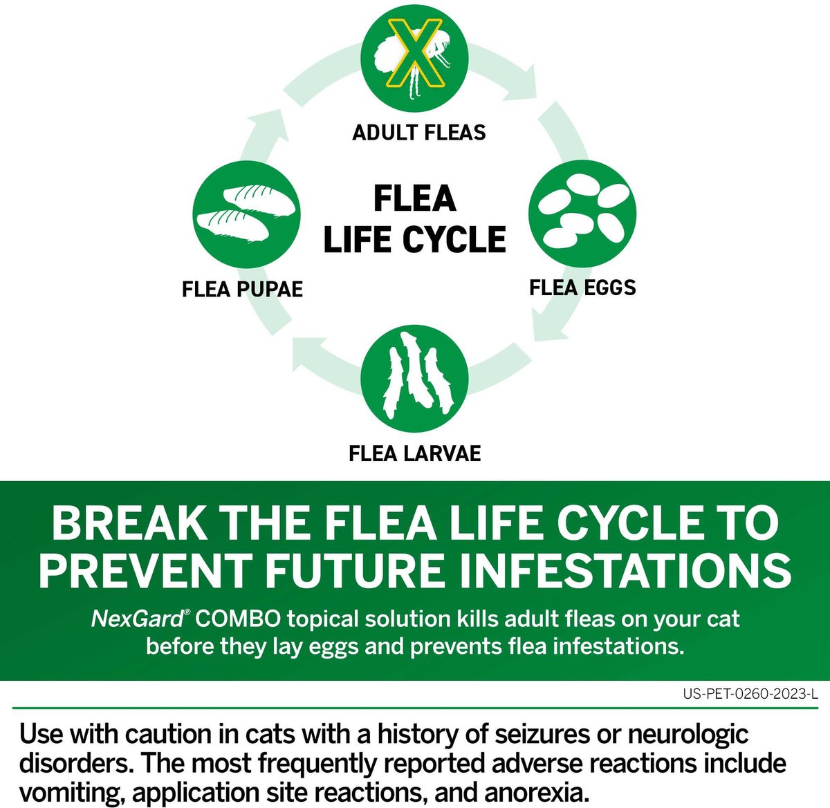 NexGard COMBO (esafoxolaner, eprinomectin, and praziquantel topical solution) is for topical use only in cats. Use with caution in cats with a history of seizures or neurologic disorders. The most frequently reported adverse reactions include vomiting, application site reactions, and anorexia. For more information, see full prescribing information or visit NexGardforPets.com.