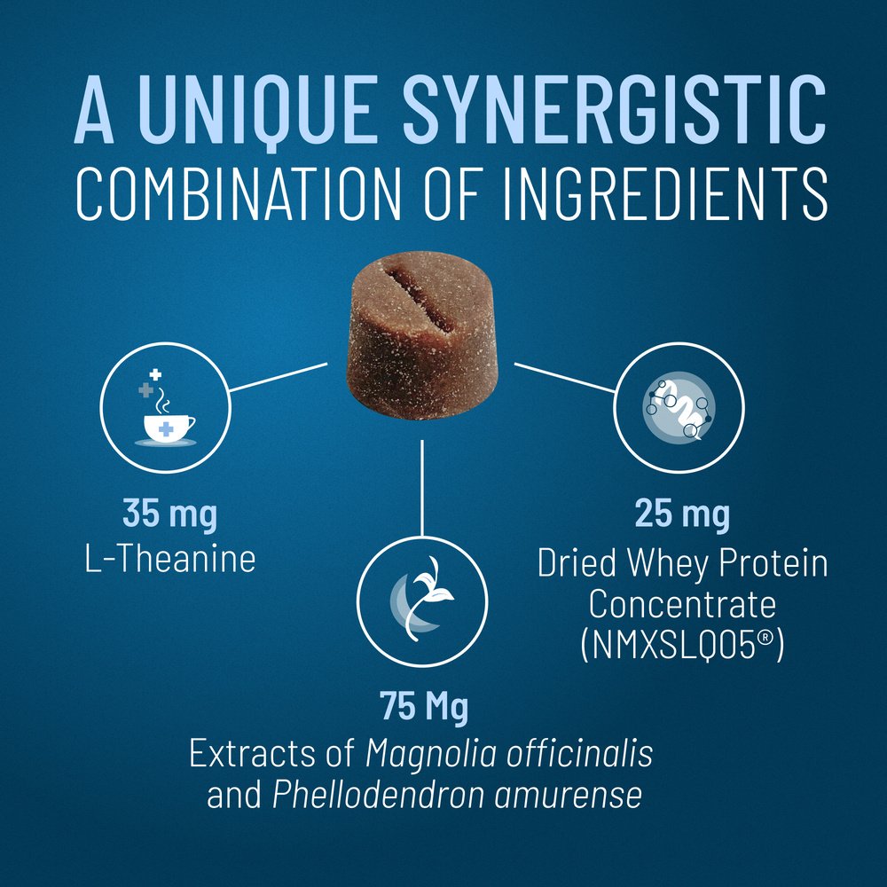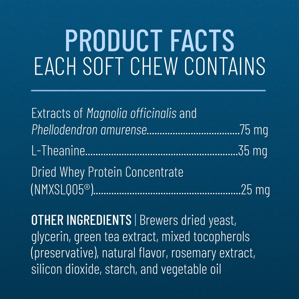There are 75-mg of Extracts Of Magnolia Officinalis And Phellodendron Amurense, 35-mg of L-Theanine, and 25-mg of Dried Whey Protein Concentrate per soft chew.