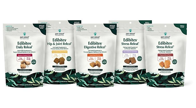 - Pet Releaf Edibites Stress Releaf Organic Peanut Butter & Carob Flavored Chew Full Spectrum Hemp Extract Calming Health Supplement for Medium & Large Dogs, 30 count$32.99 Chewy Price$31.34 Autoship PricePromo, New Customers Only: Spend $49+, Get $20 eGift Card +2 deals