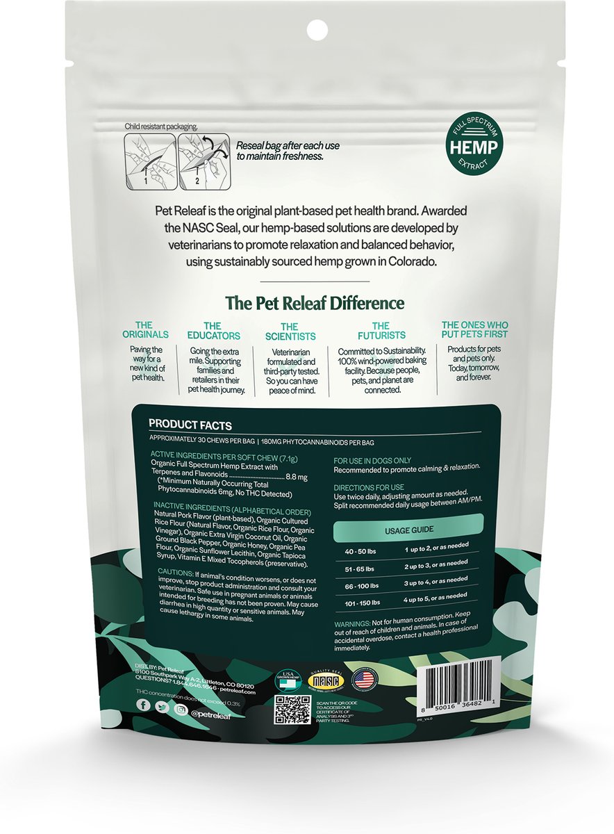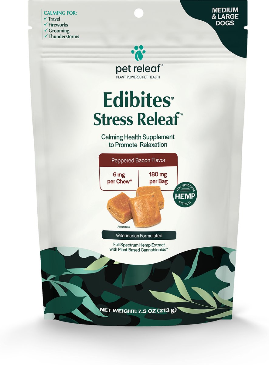 - Pet Releaf Edibites Stress Releaf Organic Peanut Butter & Carob Flavored Chew Full Spectrum Hemp Extract Calming Health Supplement for Medium & Large Dogs, 30 count$32.99 Chewy Price$31.34 Autoship PricePromo, New Customers Only: Spend $49+, Get $20 eGift Card +2 deals