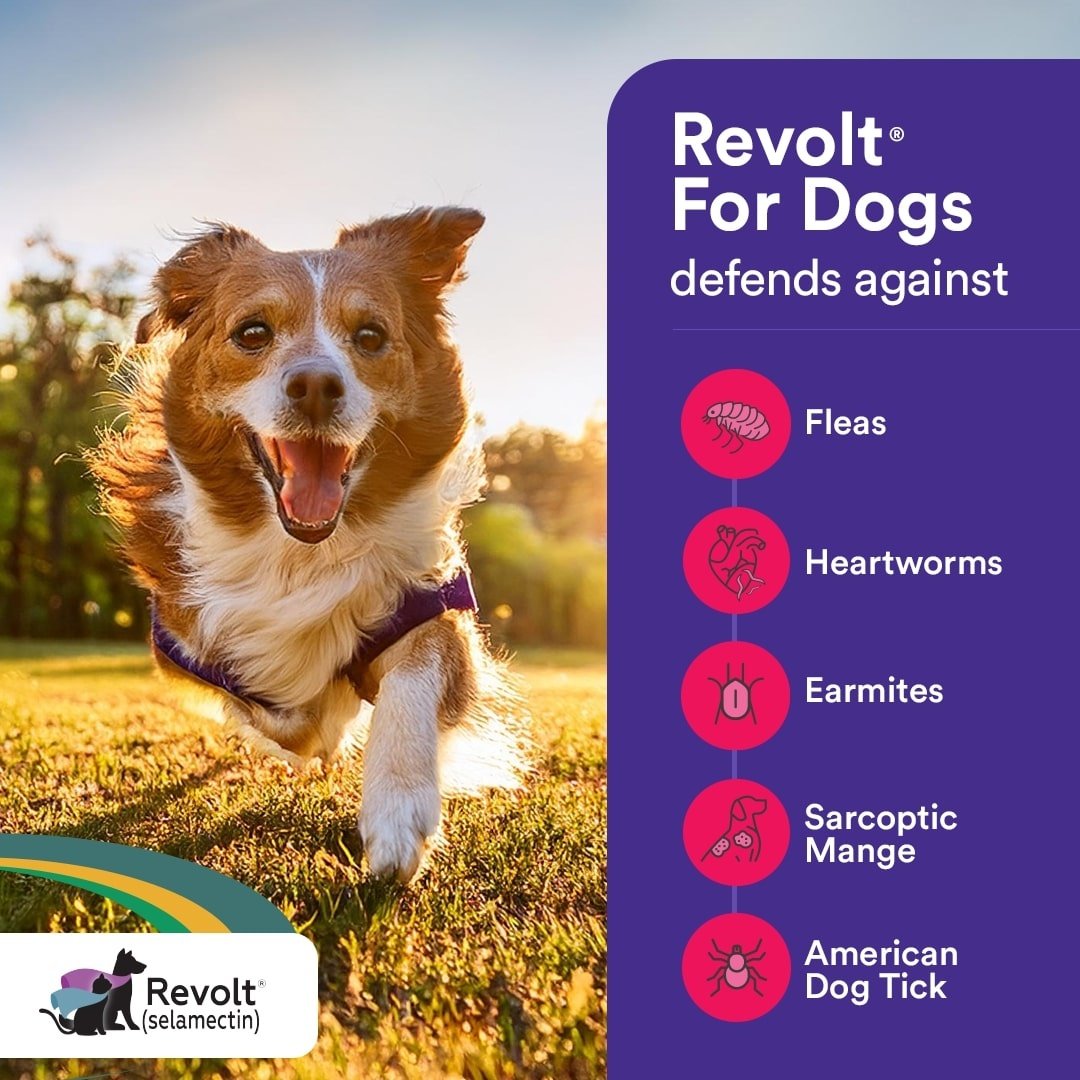 Your veterinarian is best suited to discuss and recommend appropriate medications for your dog or cat. It is important to discuss your pet's health history with your veterinarian so he/she can decide if Revolt for Dogs® is right for your animal. Revolt for Dogs® should not be used in sick, debilitated or underweight animals. Dogs should be tested for heartworm disease prior to giving Revolt for Dogs®. If your dog tests positive for adult heartworms, your veterinarian can recommend appropriate treatment. Dogs infected with adult heartworms can safely be given Revolt for Dogs®. If your dog is older than six months of age, your veterinarian may decide to test him/her for heartworm disease before prescribing Revolt for Dogs®.