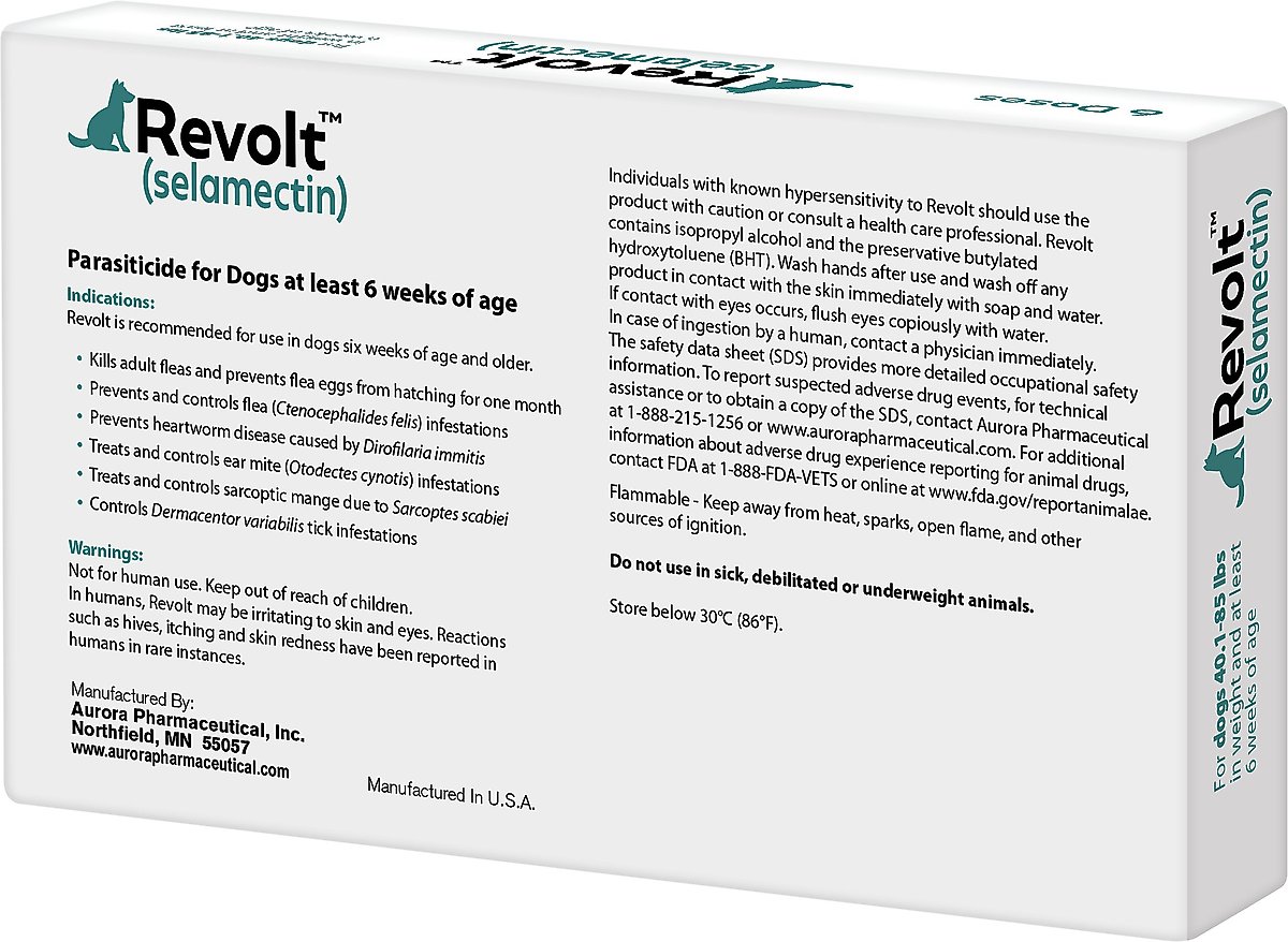 Your veterinarian will recommend the appropriate dose for your dog based on your animal's body weight. You should not administer Revolt to dogs younger than 6 weeks of age. Revolt® is available in different dose sizes for dogs of different weights.