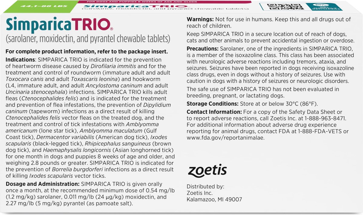 Simparica Trio Chewable Tablet for Dogs, 44.1-88 lbs, (Green Box), 6 Chewable Tablets (6-mos. supply)