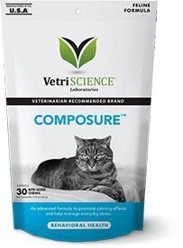 Stressed out kitties can develop behavioral and health problems, leading to issues like marking, scratching, aggressive behavior and stress-induced illness. Composure helps calm cats using a unique combination of ingredients including colostrum, L-theanine and thiamine. Just give your cat the fast-acting, easy to administer soft chews or liquid formula at the first sign of stress behavior or during stressful situations.