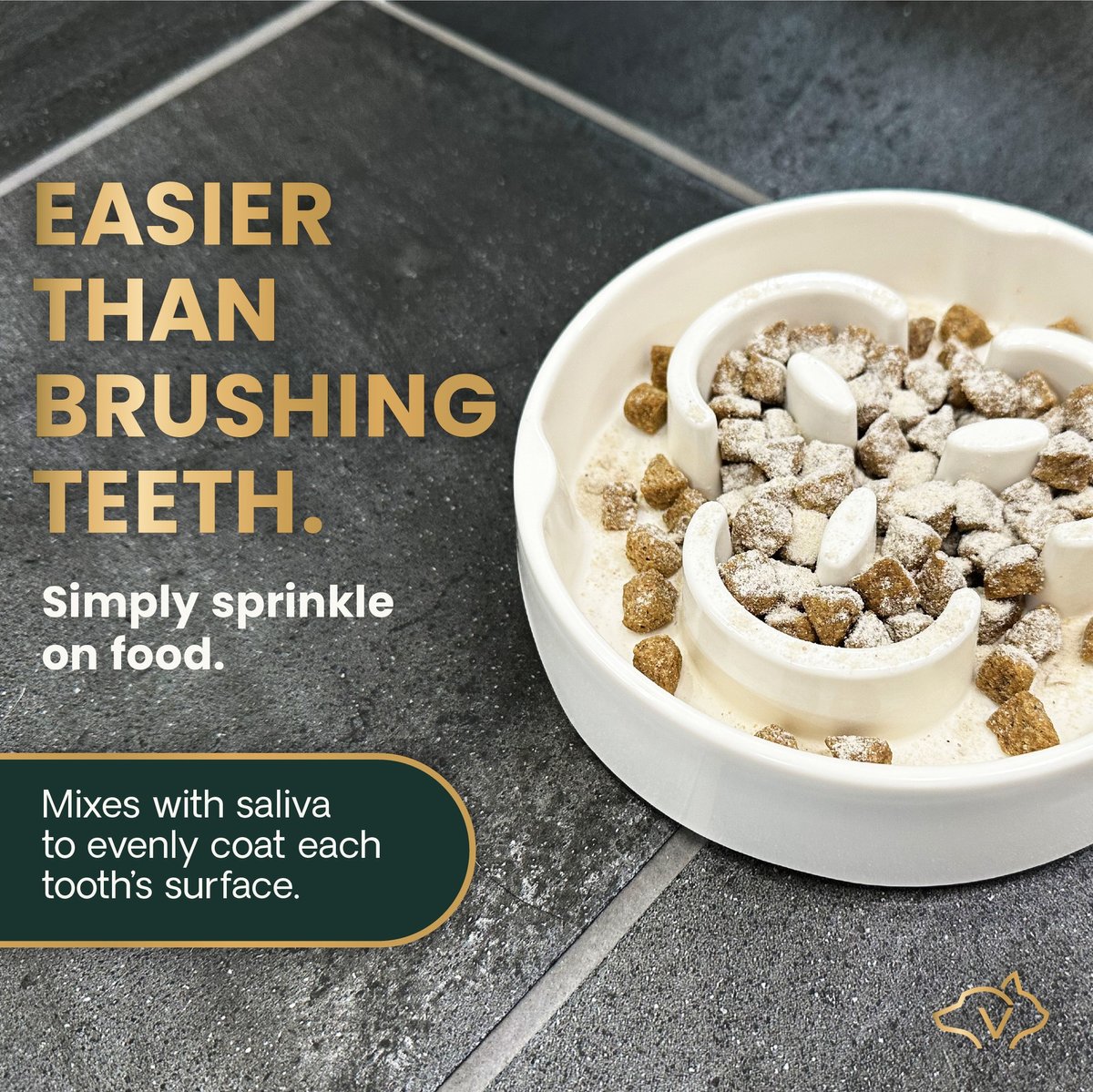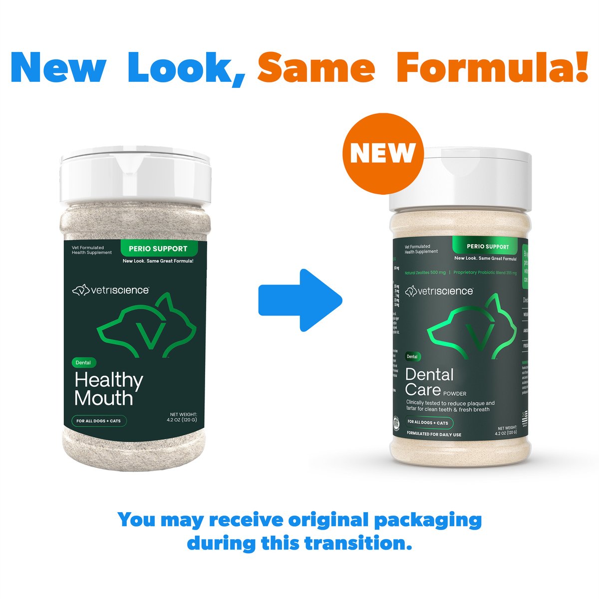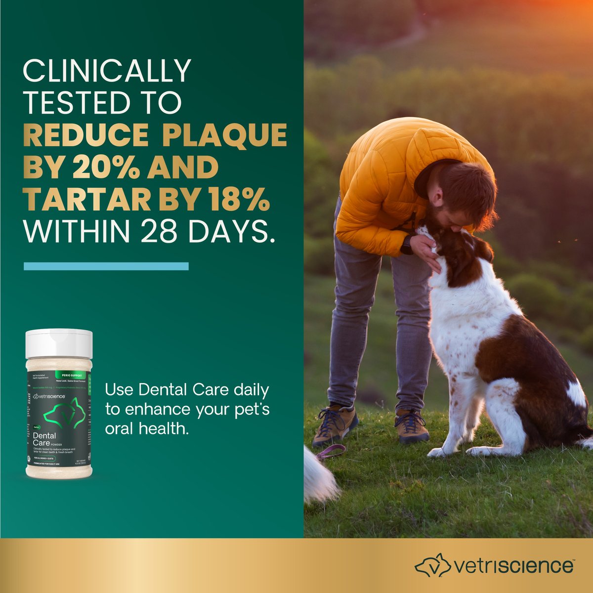 VetriScience Dental Care powder, chews, and bites are made with science-backed ingredients like zeolites and probiotics to fight plaque and zinc, cranberry, and taurine to support gum tissue health. Probiotics help freshen breath, too.