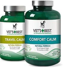 CALMING: Vet's Best Travel Calm and Comfort Calm supplements are both made with special key ingredients including valerian root, tryptophan and ginger to help keep your pup calm during stressful situations like travel, storms or loud noises.