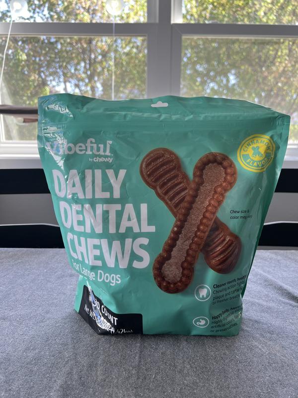 - Vibeful Medium Daily Dental Chews for Dogs, Cinnamon Flavor, 30 countBy$29.99 Chewy Price$28.49 Autoship PricePromo, New Customers Only: Spend $49+, Get $20 eGift Card +1 deal