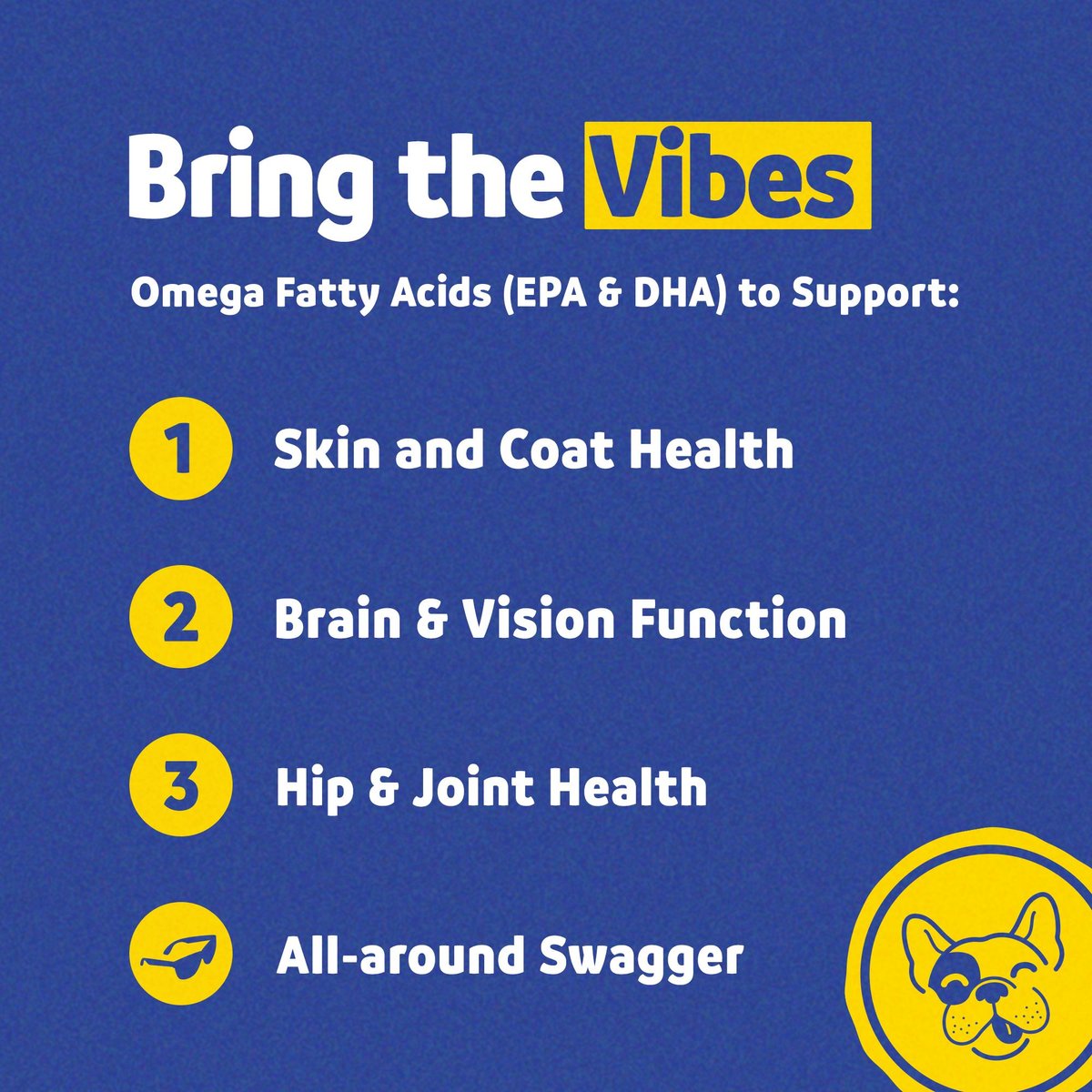 - Packed with a rich source of omega-3 fatty acids that includes EPA and DHA to nourish skin, support their immune system and overall wellness, plus keep their coat’s shine game strong. Oh, and it works overtime to support their brain and vision function, as well as hip and joint health.