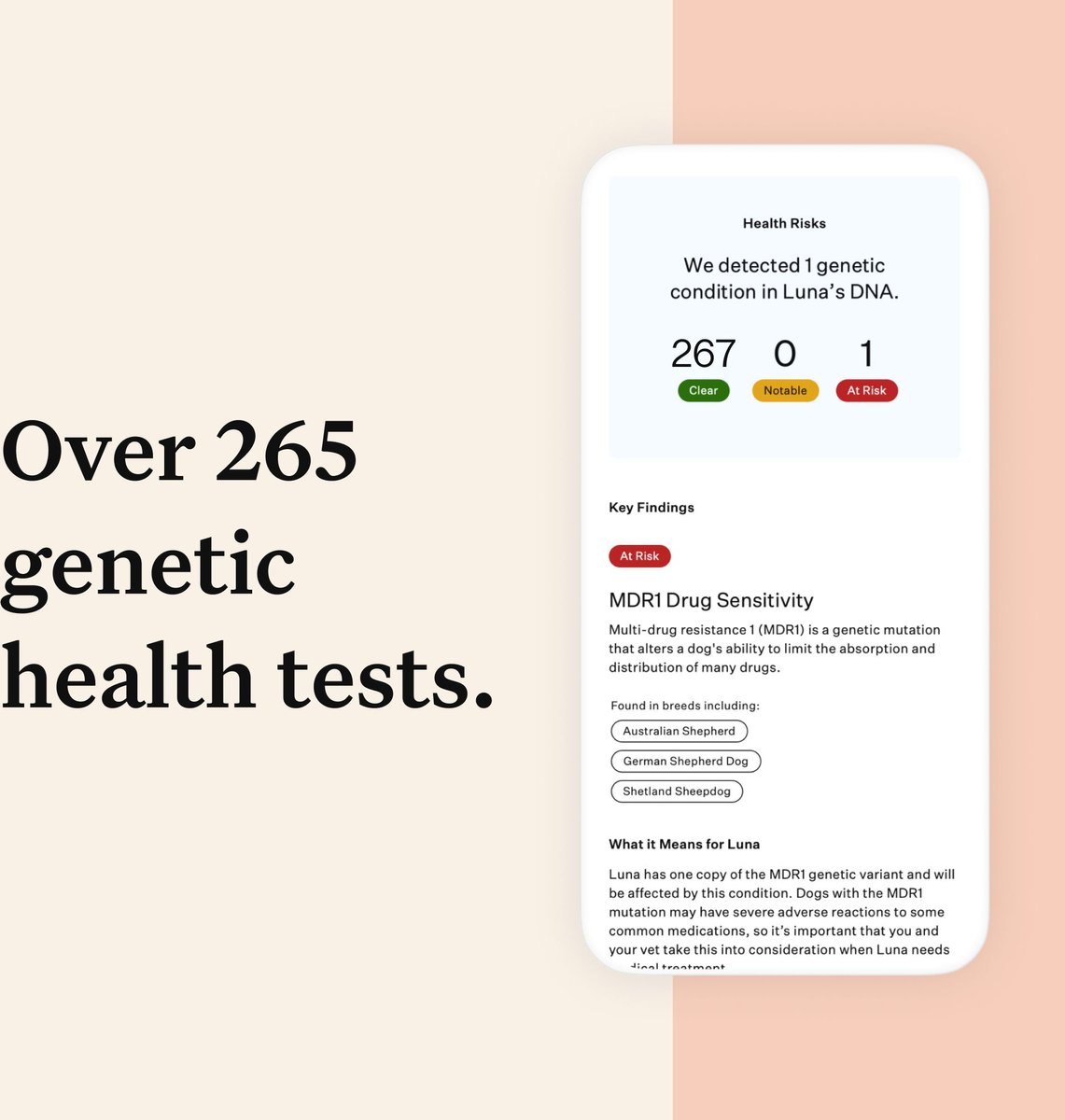 Depending on the test you choose, you'll get genetic insights into medication sensitivities, genetic health, blood type, genetic diversity, and more. Because the more you know, the more you can tailor your pet’s care accordingly.